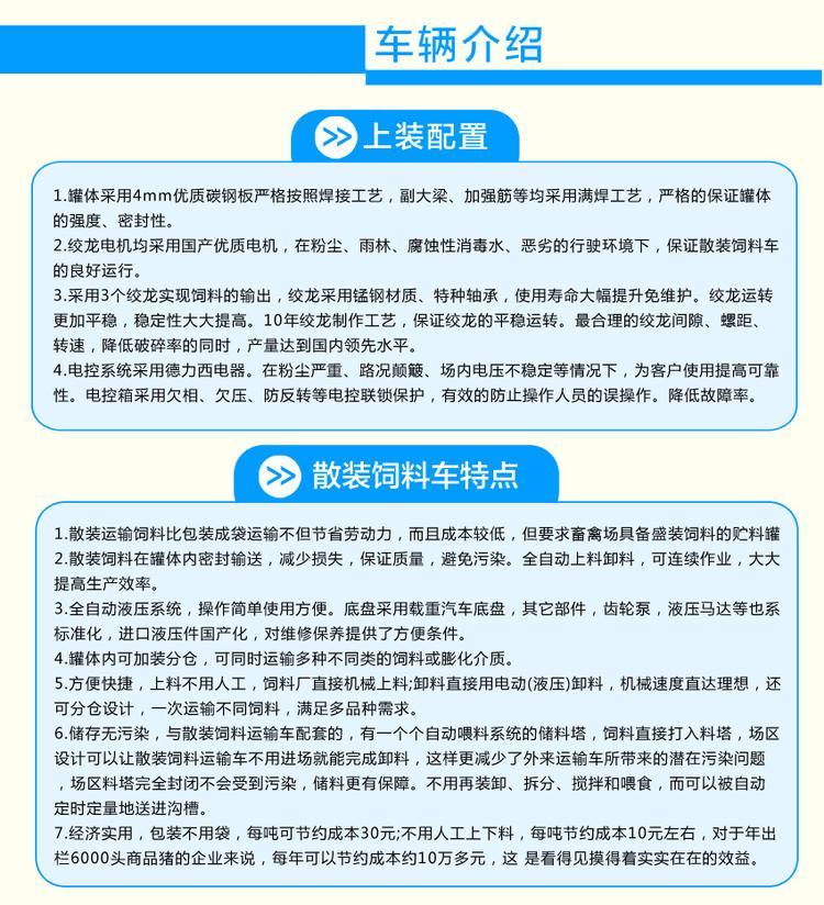 散裝飼料車有整車式和獨立罐式(可用相應載貨車運輸)等。按驅(qū)動形式分有:電動卸料散裝飼料車、全液壓卸料散裝飼料車。
