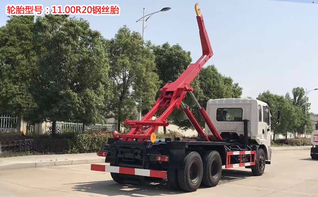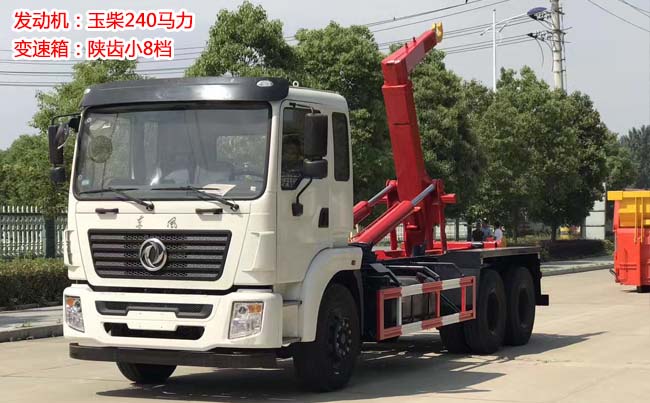 東風后雙橋勾臂式垃圾車,齊星駕駛室,玉柴240馬力發(fā)動機,陜齒小8檔變速箱,軸距4350+1300輪胎,前橋5噸,后雙10噸,11.00R20鋼絲胎,帶ABS,下防護。