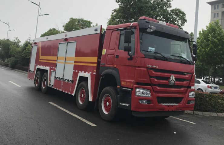 重汽豪沃24噸泡沫消防車,采用重汽豪沃ZZ5437V4667E1底盤改裝而成。整車由消防員乘員室和車身兩大部分組成,乘員室為一排半,可乘坐2人,該車為外露罐結(jié)構(gòu),車身前部為水罐,后部為泵房。載液罐體為優(yōu)質(zhì)碳鋼,與底盤采用彈性連接,載水20450kg(PM160),泡沫液量3100kg(PM240),裝備了上海茸申消防器材有限公司生產(chǎn)CB10/80型常壓消防泵,額定流量80L/S,車頂安裝成都威斯特消防機(jī)械有限公司生產(chǎn)的PL64(PM240)型車用消防炮。該車最大的特點(diǎn)是載液量大、操控性好、維修簡便?蓮V泛應(yīng)用于公安消防隊(duì)、廠礦企業(yè)及社區(qū)、碼頭等場所,撲救大型油脂類火災(zāi)或一般性性物質(zhì)火災(zāi)。