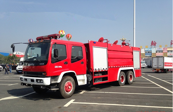 五十鈴11-12噸雙橋消防車采用慶鈴QL1250WPFZY底盤改裝,平頭雙排駕駛室,五十鈴6HK1-TCH發(fā)動機(jī),300馬力,罐體容積11-12立方米(水罐容積8立方米,泡沫罐容積3立方米);整車結(jié)構(gòu)緊湊,方便靈活,動力性能好,車速高,能自由進(jìn)出鄉(xiāng)村狹窄道路及小區(qū),具有大型消防車的全套消防功能,上裝箱體的上裝骨架全部采用引進(jìn)歐洲技術(shù)生產(chǎn)的鋁合金型材制造,整車的重量減少,機(jī)動性能和整車載重量提高。除了裝備消防水泵及器材以外,還設(shè)有較大容量的貯水罐及水槍、水炮等?蓪⑺拖廊藛T輸送至火場獨(dú)立進(jìn)行撲救火災(zāi)。也可以從水源吸水直接進(jìn)行撲救,或向其他消防車和滅火噴射裝置供水。在缺水地區(qū)也可作供水、輸水用車,主要適用于大中城鎮(zhèn)、鄉(xiāng)村狹窄街道、城市小區(qū)、繁忙的批發(fā)市場等場所的一般物質(zhì)滅火,閑暇時可用于園林噴灌、道路清灑。