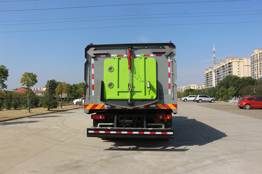 Ø 清水箱充分利用了車載空間,容積大,容積達9m3。垃圾箱采用單層304不銹鋼結(jié)構(gòu),傾翻卸料,帶高壓自潔裝置。自潔裝置可在垃圾箱卸料時幫助卸料,清洗垃圾箱內(nèi)部。