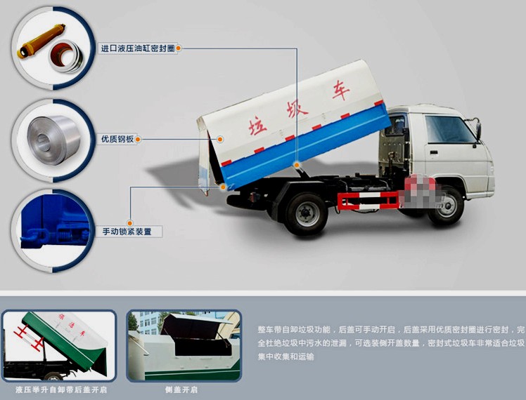 密封式垃圾車(chē)又稱(chēng)自卸式垃圾車(chē),主要由汽車(chē)底盤(pán)、箱體、開(kāi)門(mén)機(jī)構(gòu)、舉升機(jī)構(gòu)、電液控制系統(tǒng)等組成,是一種新型機(jī)、電、液一體化的全密封結(jié)構(gòu)垃圾運(yùn)輸車(chē)輛,它不但可與LSY系列垃圾站配套使用,也可廣泛用于城鎮(zhèn)居民生活區(qū)、工業(yè)區(qū)、商業(yè)區(qū)、學(xué)校、公園、風(fēng)景區(qū)等場(chǎng)所的垃圾運(yùn)輸工作